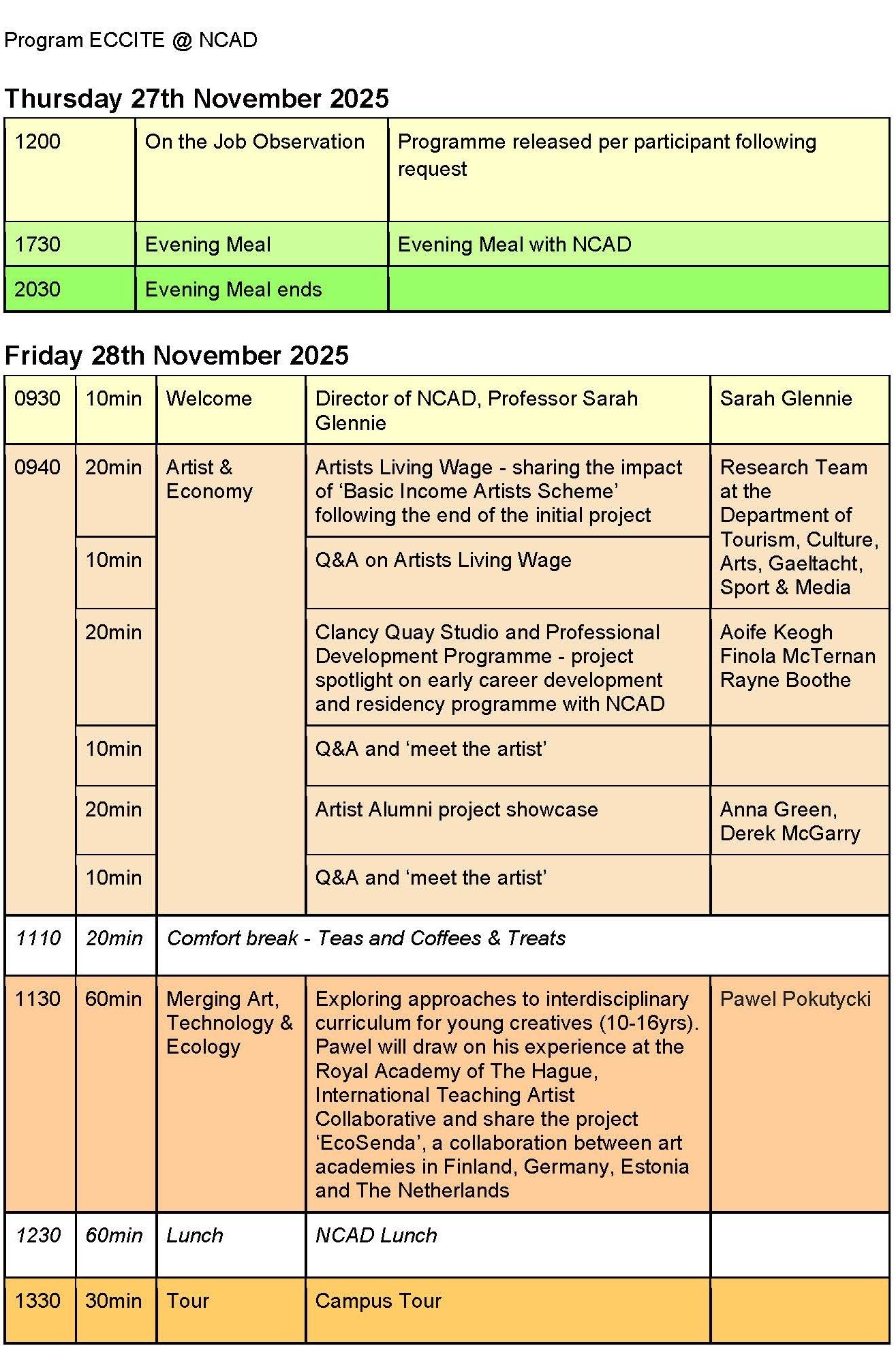 ECCITE and NCAD will arrange the dinner on the 27th, Programme and lunch on the 28th. Travel, accommodation and other meals at one’s own expense.